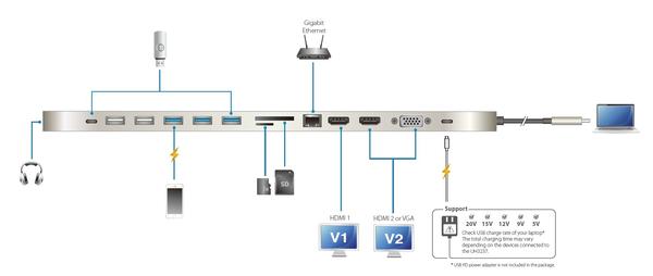 | Güç | 1 x USB Tip-C Dişi* Temel USB işlevleri ve video çıkışı için minimum sistem güç gereksinimi en az 5V, 15W olmalıdır. * 85W'a kadar şarj etmek için USB Power Delivery 3.0'ı destekler, güç profilleri 5V, 9V, 12V ve 20V içerir (ek USB-C PD güç adaptörü gerekir). * * Cihaz şarj etmek için 65 Watt'ın üzerinde Sınırlı Güç Kaynağı (LPS) sertifikalı USB-C PD güç adaptörü önerilir. * İlk 15W UH3237'yi tedarik edecek ve denge gücü dizüstü bilgisayara tedarik edecek. |